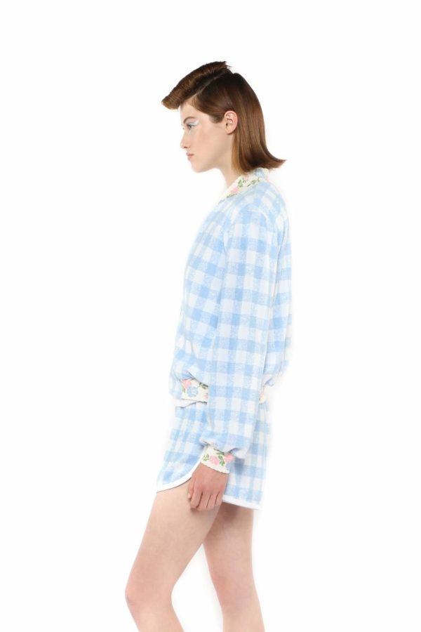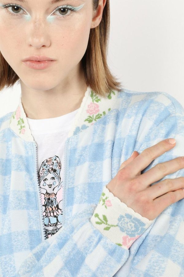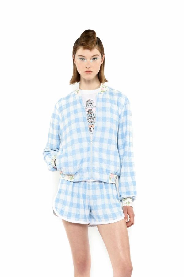 Elevate your casual wardrobe with this effortlessly chic Gingham Terry Baseball Jacket that delivers both style and comfort. Crafted from premium stretch terry cloth, this jacket offers exceptional softness with a flattering athletic silhouette. The relaxed fit features playful floral accents at the cuffs and hem, creating a fresh twist on the classic gingham pattern that’s perfect for everyday wear.