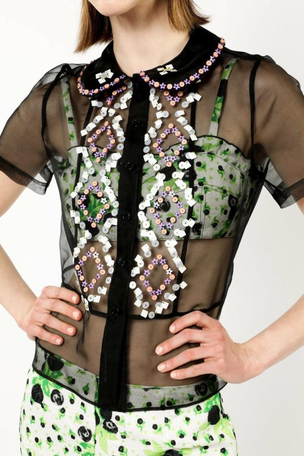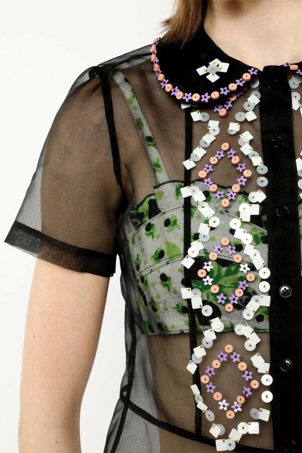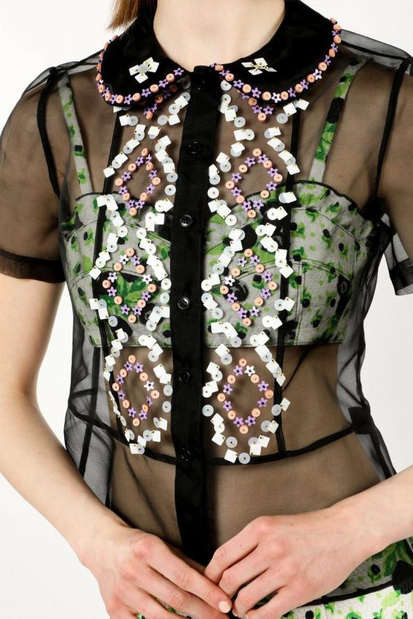 Elevate your wardrobe with this exquisite Twinkle Beaded Organza Blouse, featuring dazzling hand-embellished sequins and intricate beading that catches the light beautifully. The timeless peter pan collar adds a touch of sophisticated charm, making this blouse the perfect statement piece for special occasions and elegant evenings out.