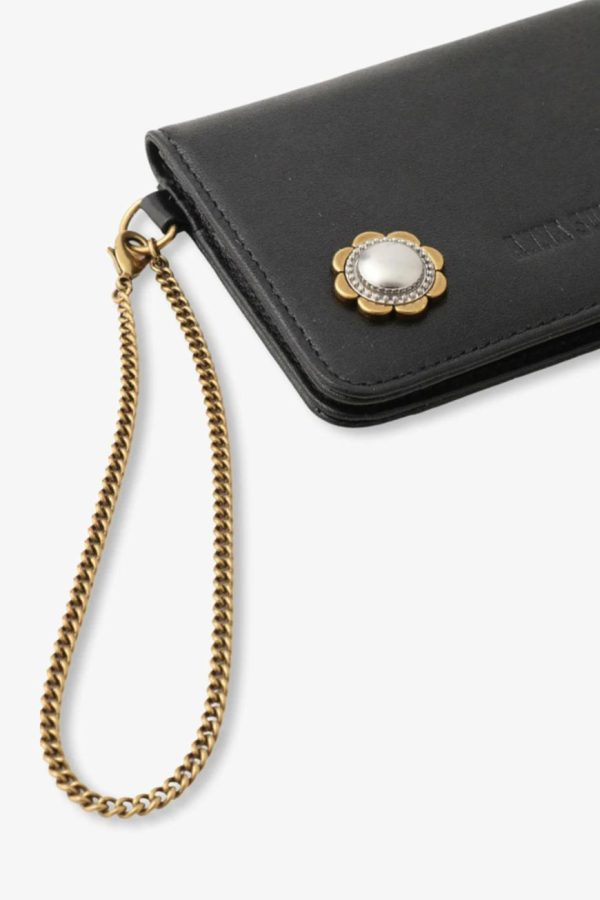 Retro style leather pass case with vintage inspired flower buttons and chain attachment