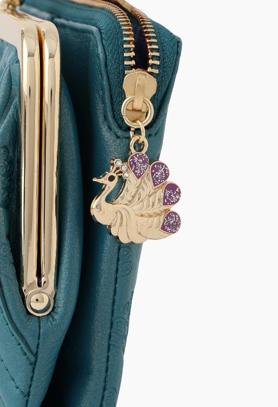 The Peacock Embossed Wallet is a stylish, large wallet with an embossed peacock feather pattern, gold studs, and a playful peacock zipper pull. Designed for both function and flair, it features a secure clasp and plenty of compartments to keep your essentials organized.