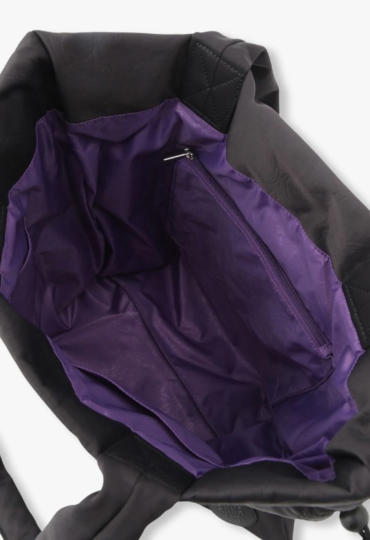 Designed for both fashion and function, this tote features a spacious interior with three compartments to help you stay organized on the go. The drawstring closure keeps your belongings secure while maintaining the bag’s stylish silhouette. Inside, you’ll find a striking purple lining adorned with delicate roses and butterflies, adding a touch of elegance and whimsy to the bag’s overall design.