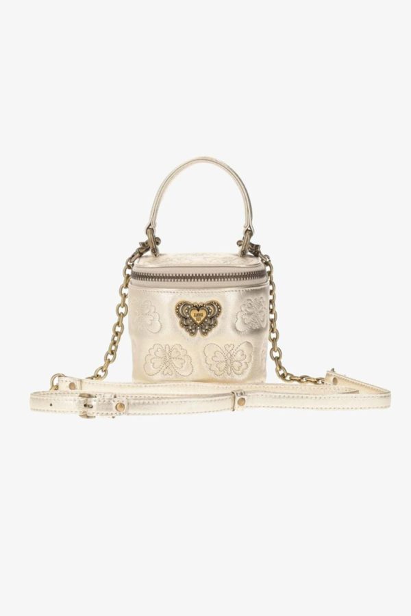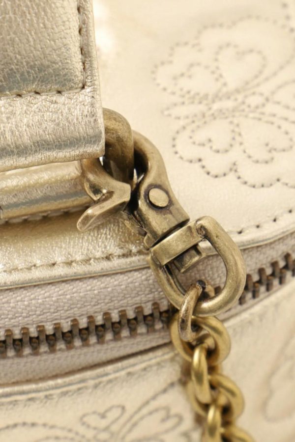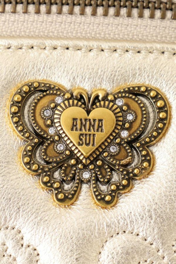 - Exterior: The Miniature Chase Crossbody is constructed with sheep leather and embossed with Anna Sui signature butterflies. Includes an all around zipper enclosure. With a gold heart butterfly charm secured to the front of the bag. Butterfly hardware in matching color to the leather and chain link crossbody strap.