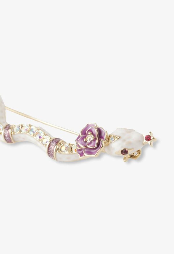 This stunning Bejeweled White Snake Brooch is a captivating blend of elegance and nature-inspired beauty. The intricately designed white snake is adorned with shimmering jewels that glisten with every movement, creating a luxurious yet bold statement piece. Resting delicately atop the snake is a vibrant purple rose, adding a pop of color and a touch of femininity to this eye-catching brooch. Whether pinned to your jacket, scarf, or bag, this brooch will elevate any outfit with its unique charm and sophisticated flair.