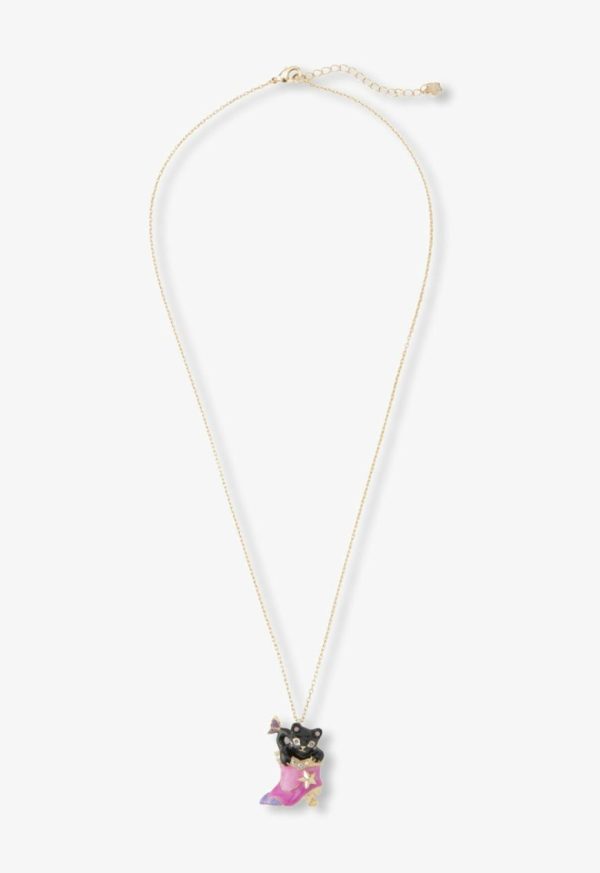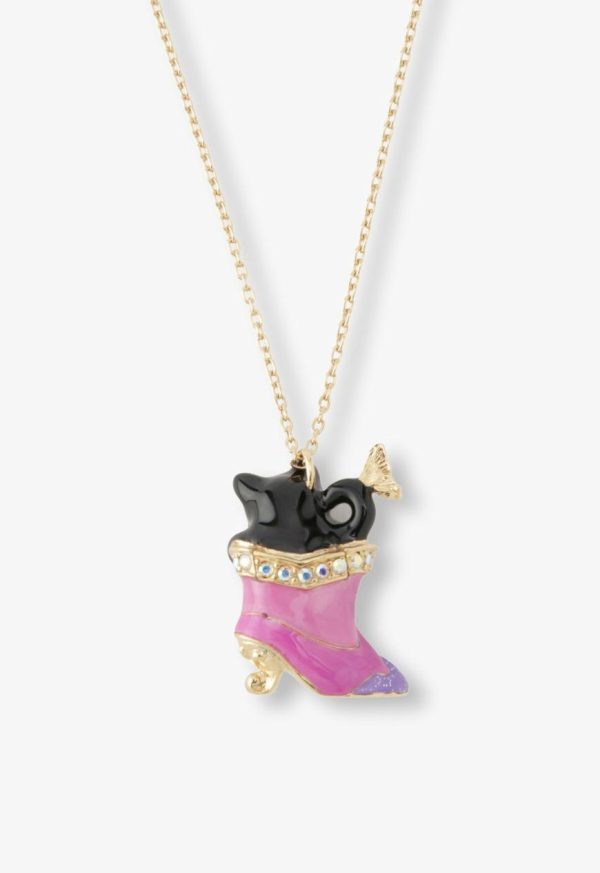 Embrace charm and elegance with the Whimsical Cat & Butterfly Necklace. This delightful piece features an adorable cat nestled inside the iconic Anna Sui boot, with a butterfly perched delicately on the cat’s tail. The cat’s jeweled eyes and sparkling accents on the boot bring a touch of magic and glamour, making this necklace a captivating statement piece