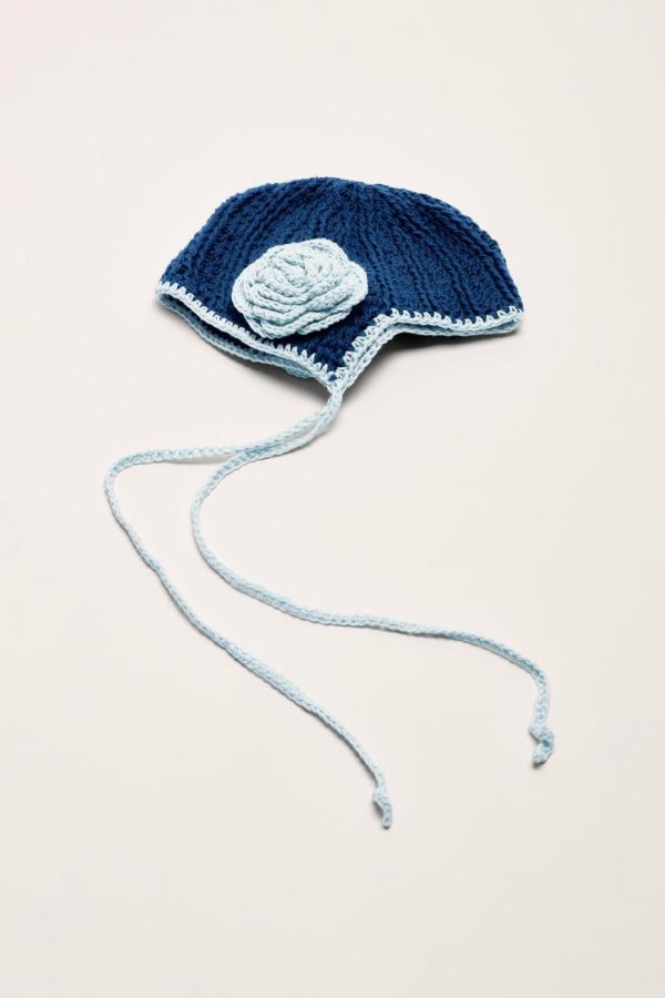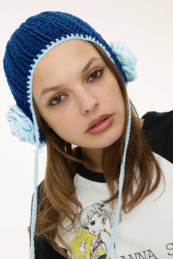 - Hand Crocheted beanie. Knit rosette details. Features adjustable ties.