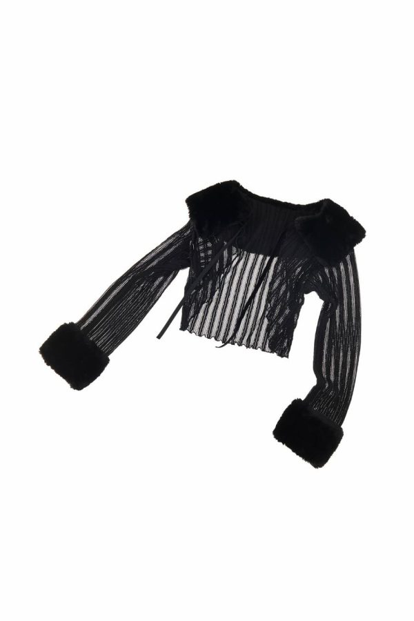- Fitted knit bolero with faux fur collar and cuffs. Includes adjustable ties at neck.